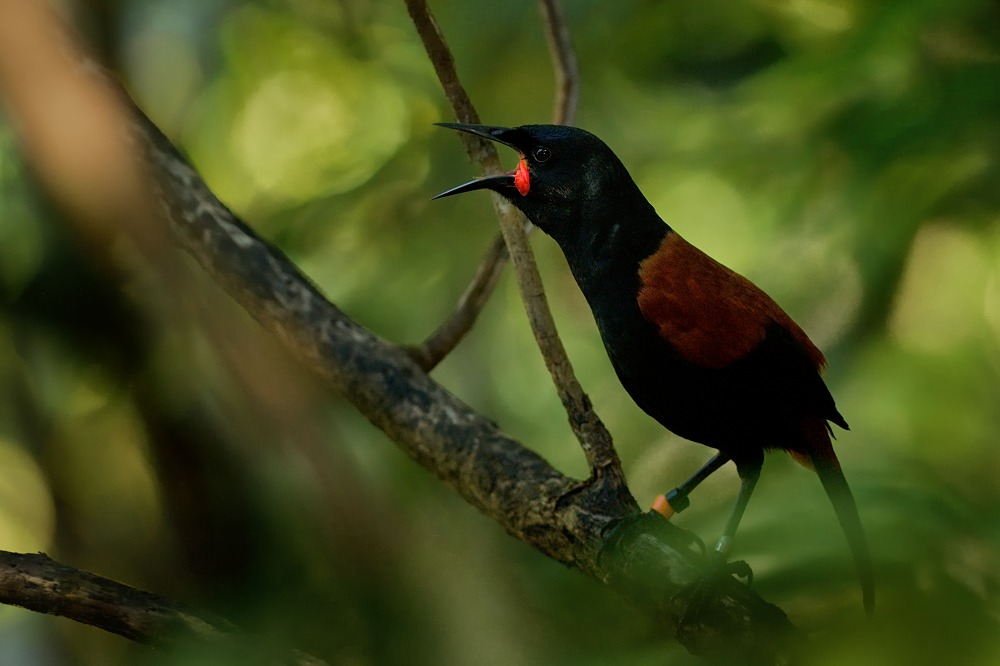 Laločník sedlatý - Philesturnus rufusater - North Island Saddleback - tieke